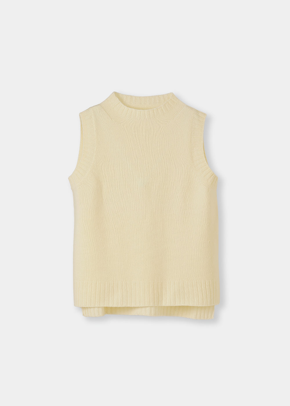 ニットの産地、群馬県太田市がより良いものづくりを掲げて生産するOTA KNIT(おおたニット)。肌触りが柔らかで、チクチク感が少ないソフトウールで編み立てました。(OTA KNIT/太田市製ホールガーメント)襟元をたち上げたベーシックなベスト。着丈は後ろの方がやや長めで、腰周りをさりげなくカバーしてくれます。(サイドスリット入り)冬の定番になるシンプルベストです。