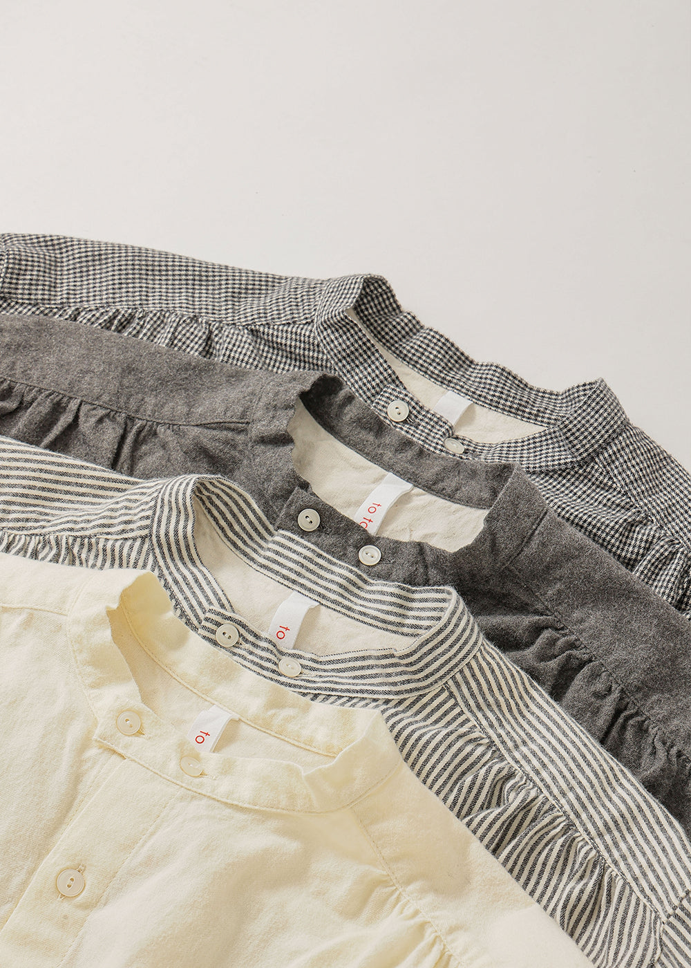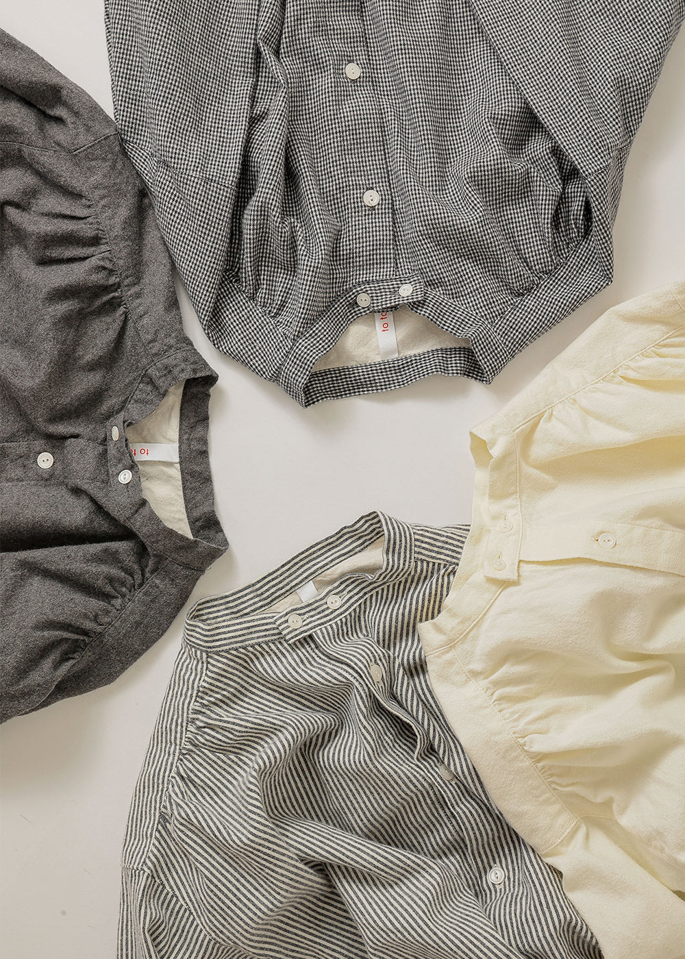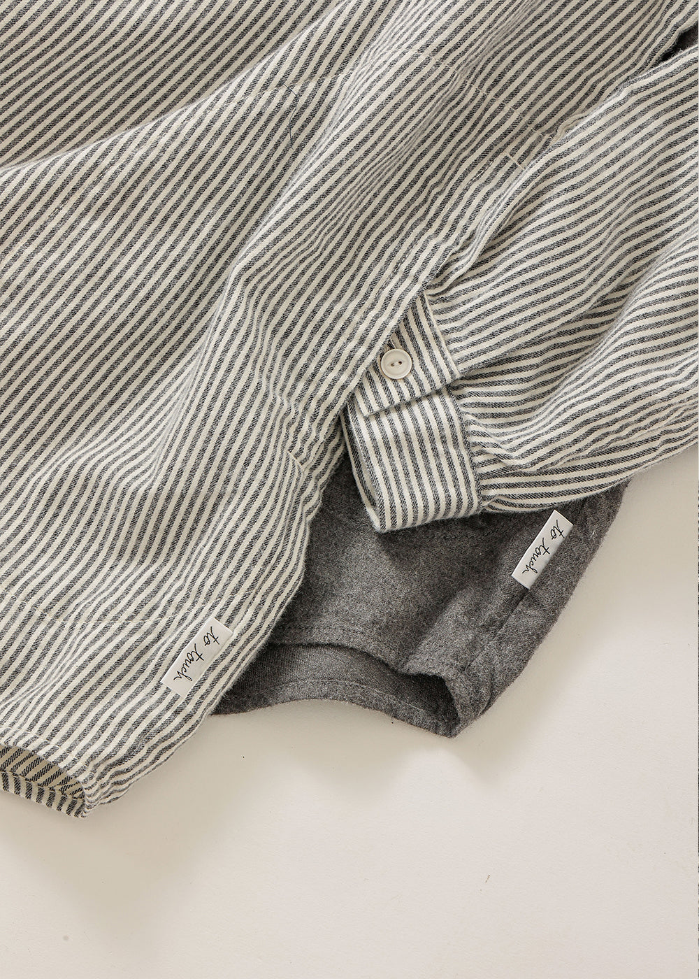 60/2の薄手のコットン起毛生地。柔らかく肌触りが良いので、冬のセーターのインナーにも最適な素材です。肩まわりにギャザーが入ったゆったりシルエットのオーバーシャツ。サイドポケットが付いていて、シャツですが羽織りとしても活躍します。薄くて軽いので、ちょっとした旅行にも便利ですね♪