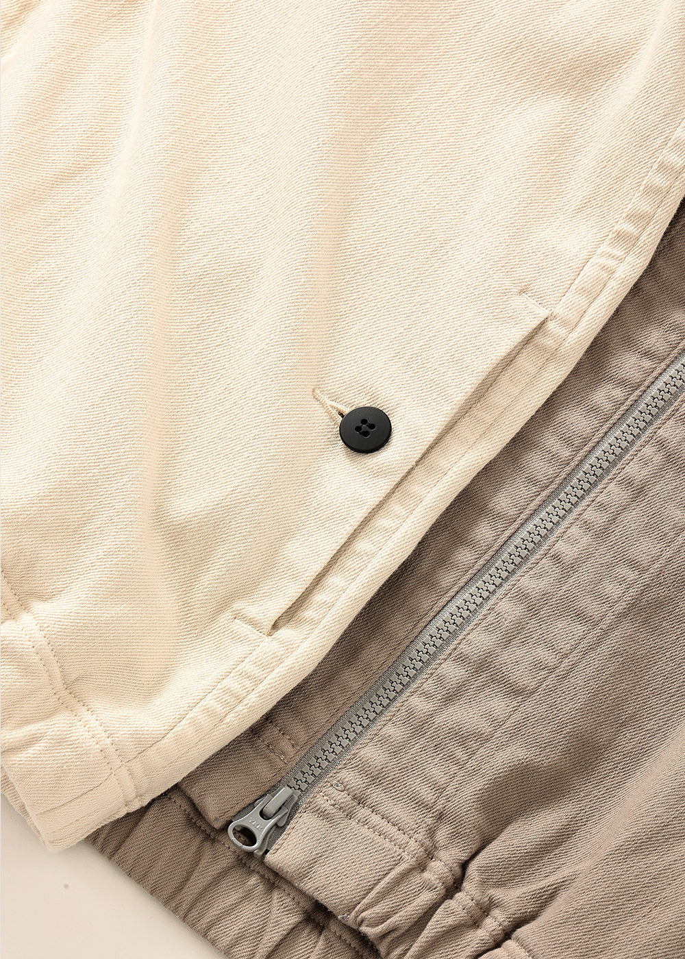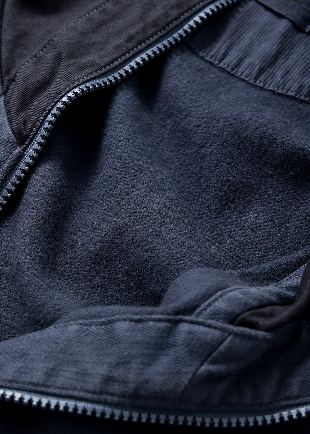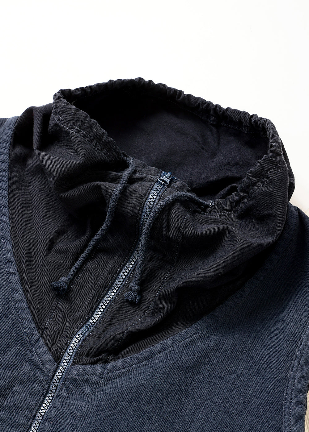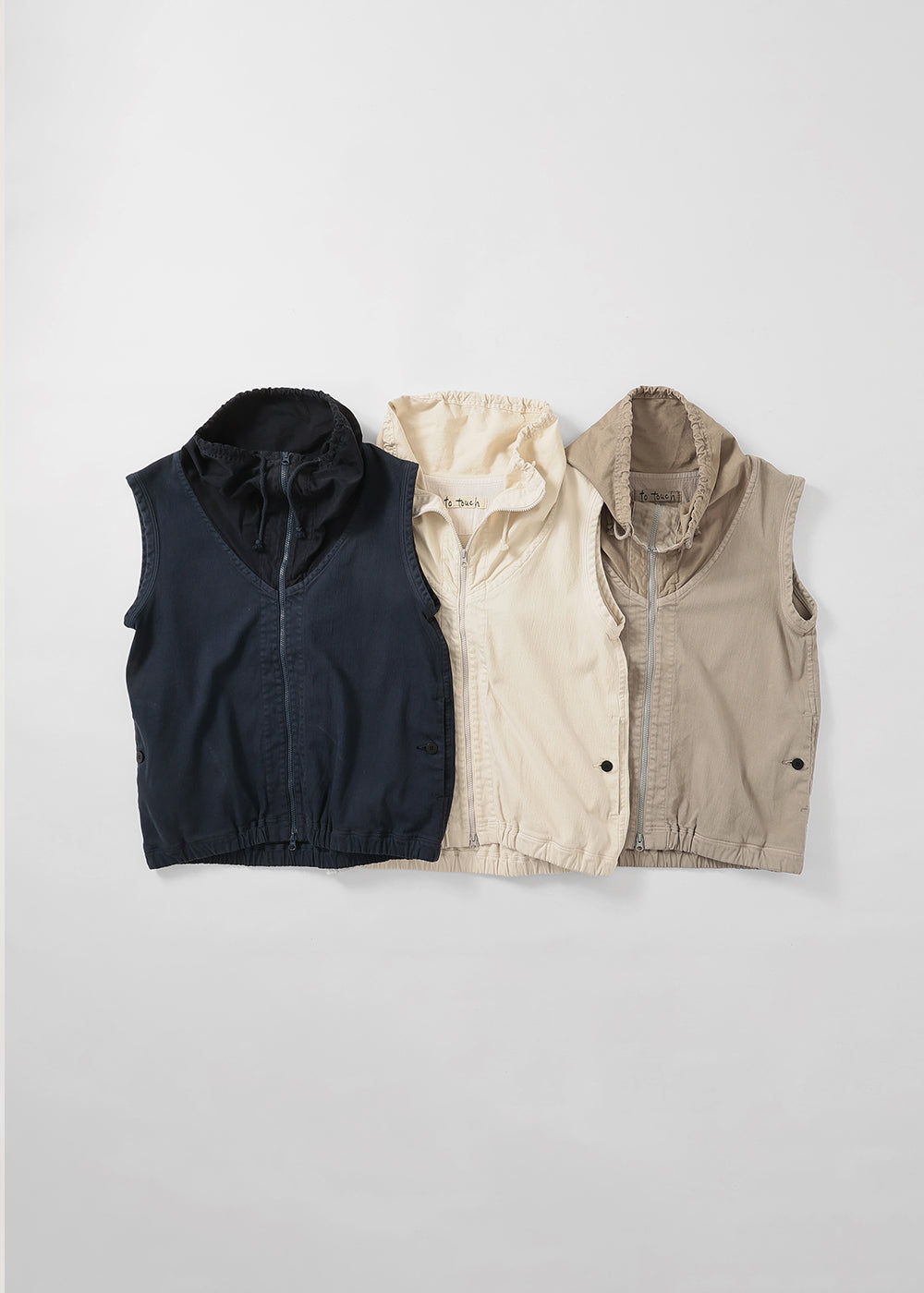 ツイル織コットンのストレッチ素材を製品染めした、柔らかな中肉素材。ファスナーの上げ下げで、襟元の表情が変化する裏起毛のコットンベスト。襟先のコードを少し絞ってファスナーをひらけば、ウイングカラーに変身したり、シーズンに応じて着方をチェンジできるアウターベストです。大きなサイドポケットも、中は起毛で暖かです。