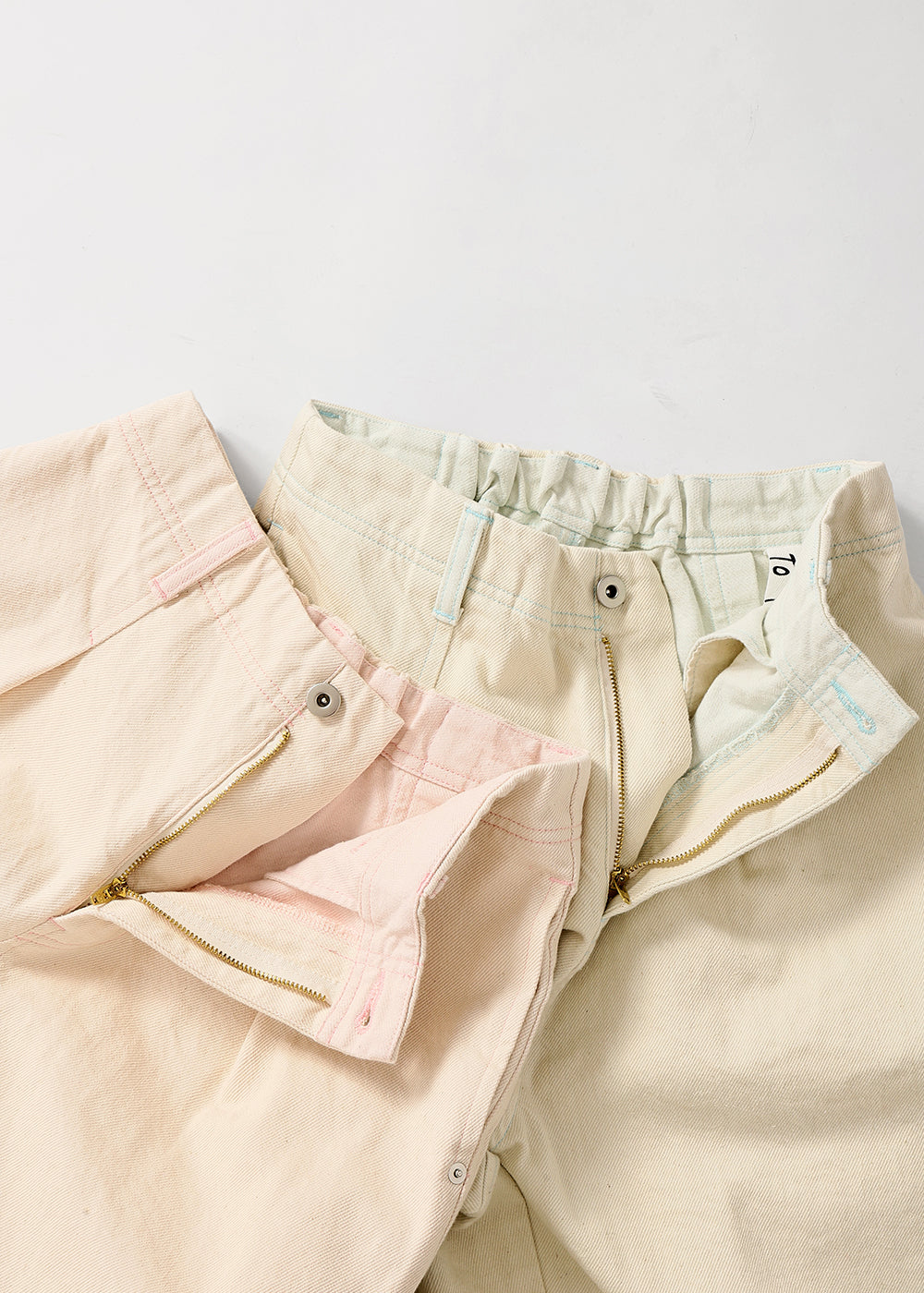 表側に生成、裏側にパステルカラーの糸を使用した2トーンデニム。